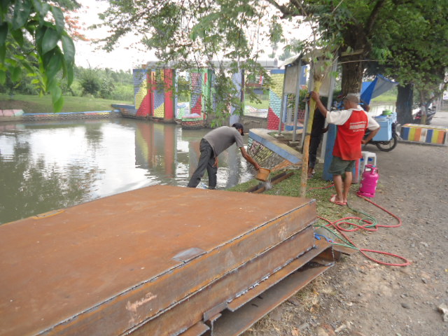 “Nantinya pemasangan plat teser baja ini masih lama karena menunggu sepainya air.kalau sudah sepai air baru dikerjakan semua ini masih dalam proses.”ungkap Enok.
