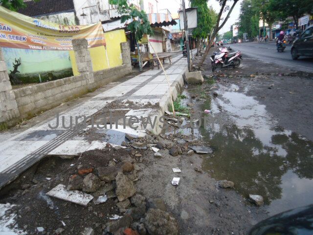 GAMBIRAN – Warga harus merusak trotoar dengan cara menjebol, karena air selalu meluap kejalan raya, diduga trotoar yang dirusak karena tersumbat hingga mengakibatkan air meluap kejalan raya.