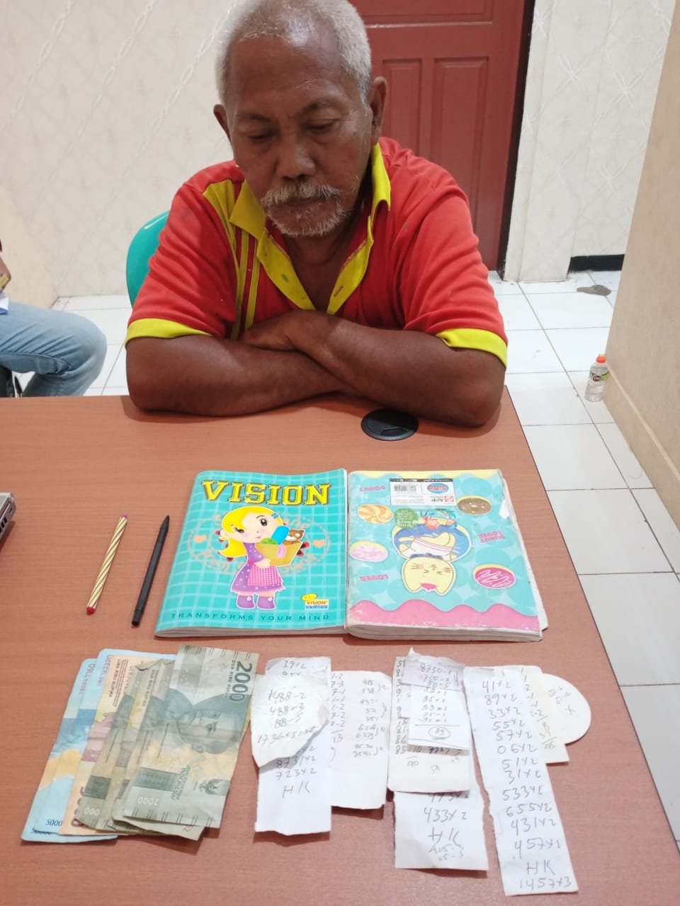 “Barang Bukti yang diamankan dari pelaku sejumlah Uang sebesar Rp 115.000, 11 lembar potongan kertas kecil bertuliskan angka angka, 2 buah catatan sketan angka angka dan 2 buah bolpin, “kata Kanit Reskrim Ipda Sadimun.