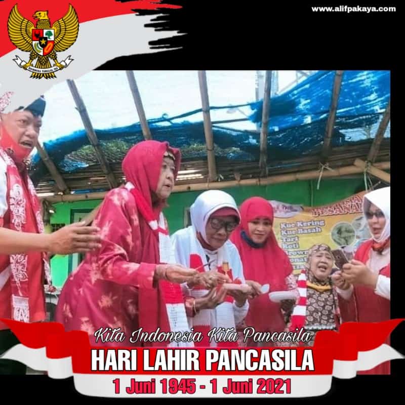 Beliau juga menambahkan kata Bhineka Tunggal Ika itulah yang membuat nusantara ini tetap bersatu dan tidak dapat dicerai beraikan. Selanjutnya berdoa bersama-sama dan pemotongan kue puding persembahan Puji Winarsi penyandang difabel kaki tanda rasa syukur harlah Pancasila ke-76 yang dipotong istri pelaku perang 10 Nopember bareng Bung Tomo dan Mas Isman, Hj.Wahyuni Oneng Soedarsono, Pr (85).