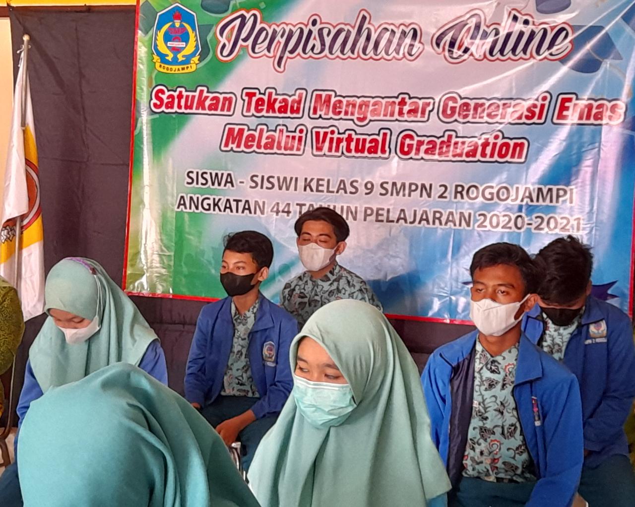 Masa pandemi Covid-19 tidak mengurangi sekolah, siswa dan guru untuk merayakan kegembiraan dalam pengumuman kelulusan tingkat SMP yang telah diumumkan serentak pada sehari sebelumnya ( 4/6 ).Perayaan kegembiraan ini salah satunya juga dilaksanakan SMPN 2 Rogojampi salah satu sekolah unggulan di Jalan Diponegoro 77 menggelar virtual graduation atau wisuda daring siswa. Dinas Pendidikan Kabupaten Banyuwangi secara implisit juga telah mengimbau agar sekolah tidak menyelenggarakan acara perpisahan yang berpeluang menciptakan kerumunan masa. Merespon himbauan tersebut, SMPN 2 Rogojampi mengadakan acara pelepasan siswa kelas 9 melalui virtual graduation. Acara ini menjadi alternatif acara perpisahan sekolah di tengah pandemi virus Corona. Acara ini diadakan menggunakan aplikasi Zoom dan video streaming yang diikuti 150 orang , murid dan komite dan wali murid kelas 9 SMPN 2 Rogojampi. Acara dimulai dengan menyanyikan lagu Indonesia Raya yang dirangkai dengan menyanyikan Mars SMP Negeri 2 Rogojampi acara dilanjutkan menyimak sambutan kepala sekolah, komite sekolah sebagai perwakilan wali murid dan mendengar pesan serta kesan siswa kelas 9 dan kelas 8 secara daring di SMPN 2 Rogojampi . Acara pelepasan siswa dilakukan melalui aplikasi Zoom mulai pukul 12.00 – 13.00 WIB untuk kelas 9 A sampai 9 H.