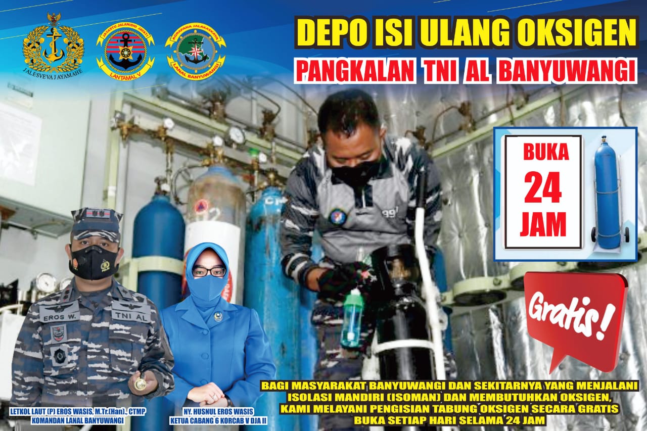 Komandan Pangkalan Angkatan Laut Letkol Laut (P) Eros Wasis, M.Tr.Han, CTMP menjelaskan kepada Masyrakat Banyuwangi insyaaAlloh mulai Hari Selasa tanggal 3 Agustus Mako Angkatan Laut Banyuwangi sudah siap menyediakan pengisian oksigen isi ulang gratis 24 jam dan Sudah berkoordinasi dengang pihak PT.Samator Banyuwangi,Mengingat akan kebutuhan oksigen di Banyuwangi meningkat 6x s.d 7x lipat dari biasanya,” Ujarnya”