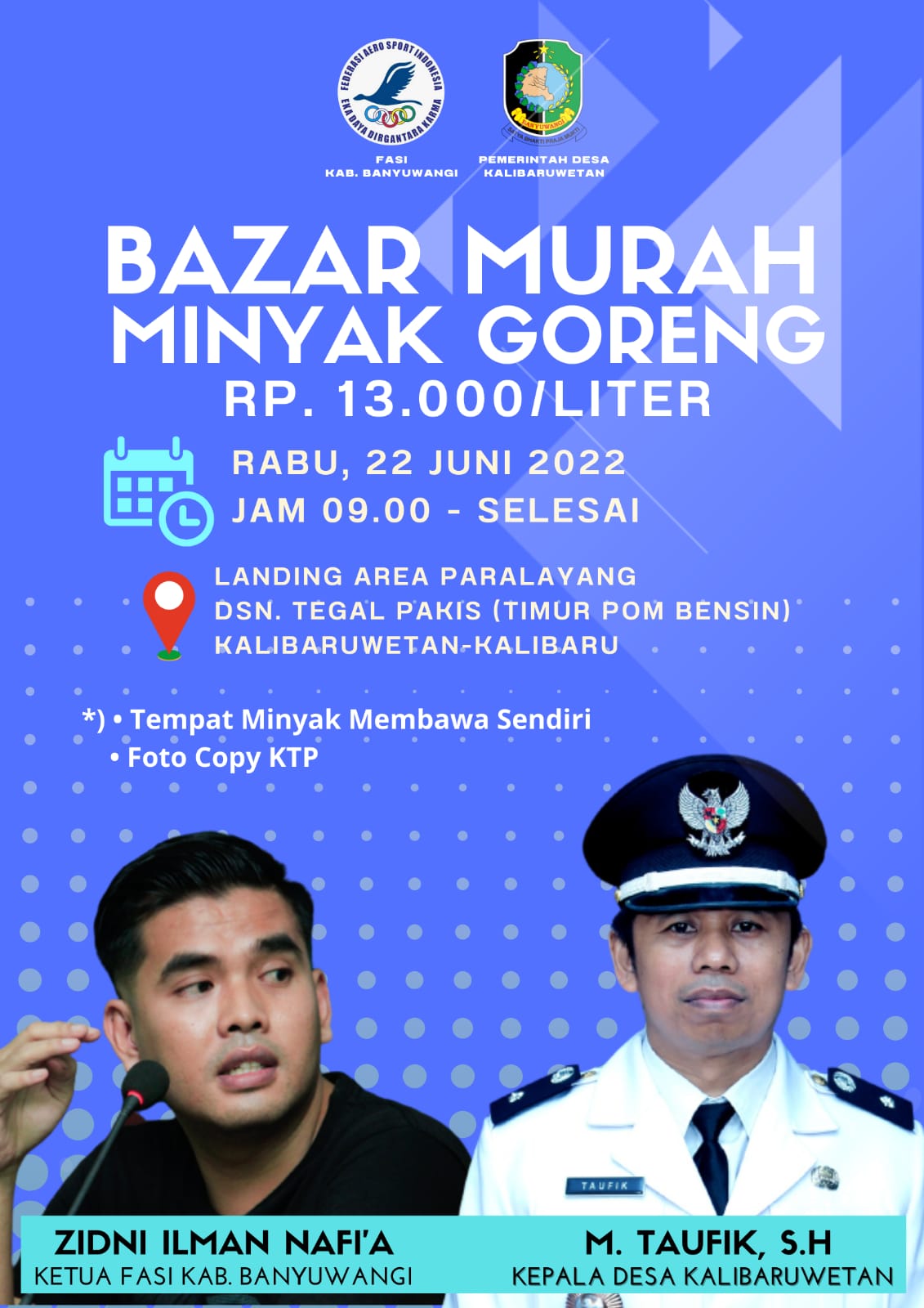 Federasi Aero Sport Indonesia (FASI) Kabupaten Banyuwangi bekerjasama dengan Pemerintah Desa Kalibaruwetan dan Fatayat NU Kalibaru menggelar Bazar Murah minyak goreng, Rabu (21/06/2022).