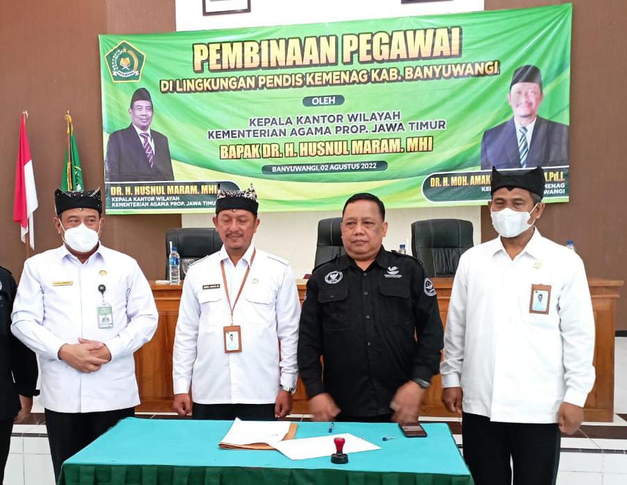Selain disaksikan Kakanwil Kemenag Jatim, penandatanganan MoU yang dilakukan oleh Kakankemenag Kabupaten Banyuwangi bersama Ketua LRPPN BI Banyuwangi, Moh. Hiksan, yang didampingi Hakim Said selaku pembina Panti Rehabilitasi Terpadu bersama dokter Peksos Teguh Arif dan Kasubag TU Kantor Kemenag Banyuwangi, H. Djali beserta para kasi dan juga 75 audien yang terdiri dari KKG-RA, KKG-MI, KKGMTs, KKG-MA, Kepala MIN, Kepala MTsN dan Kepala MAN dan perwakilan dari unsur Ponpes. “Bismillah hirirrohmanirrohim, semoga MoU ini bermanfaat bagi semua pihak,” ucap Amak Burhanudin, saat teken tandatangannya, Selasa (2/8/2022) siang.