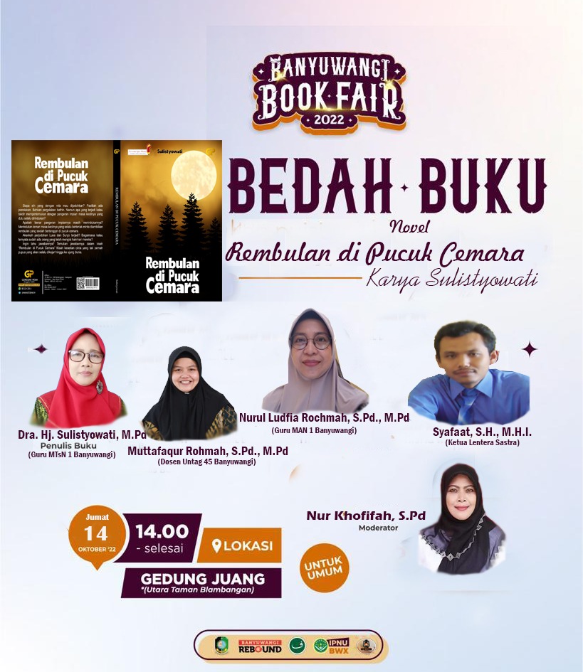 Novel karya Dra. Hj. Sulistyowati, M.Pd dengan Judul Rembulan di Pucuk Cemara  dibedah Komunitas Lentera Sastra dalam Jambore Literasi Banyuwangi Book Fair pada hari ke sembilan, Jumat (14/10/2022)