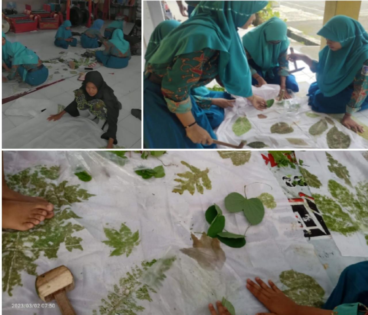 Mendidik siswa untuk mencintai lingkungan tidak harus selalu dilakukan dengan menanam dan merawat tumbuhan saja. Sebagaimana yang dilakukan siswi kelas IX-A SMPN 2 Rogojampi membatik dengan teknik ecoprinting untuk memanfaatkan media dedaunan (01/03/2023).