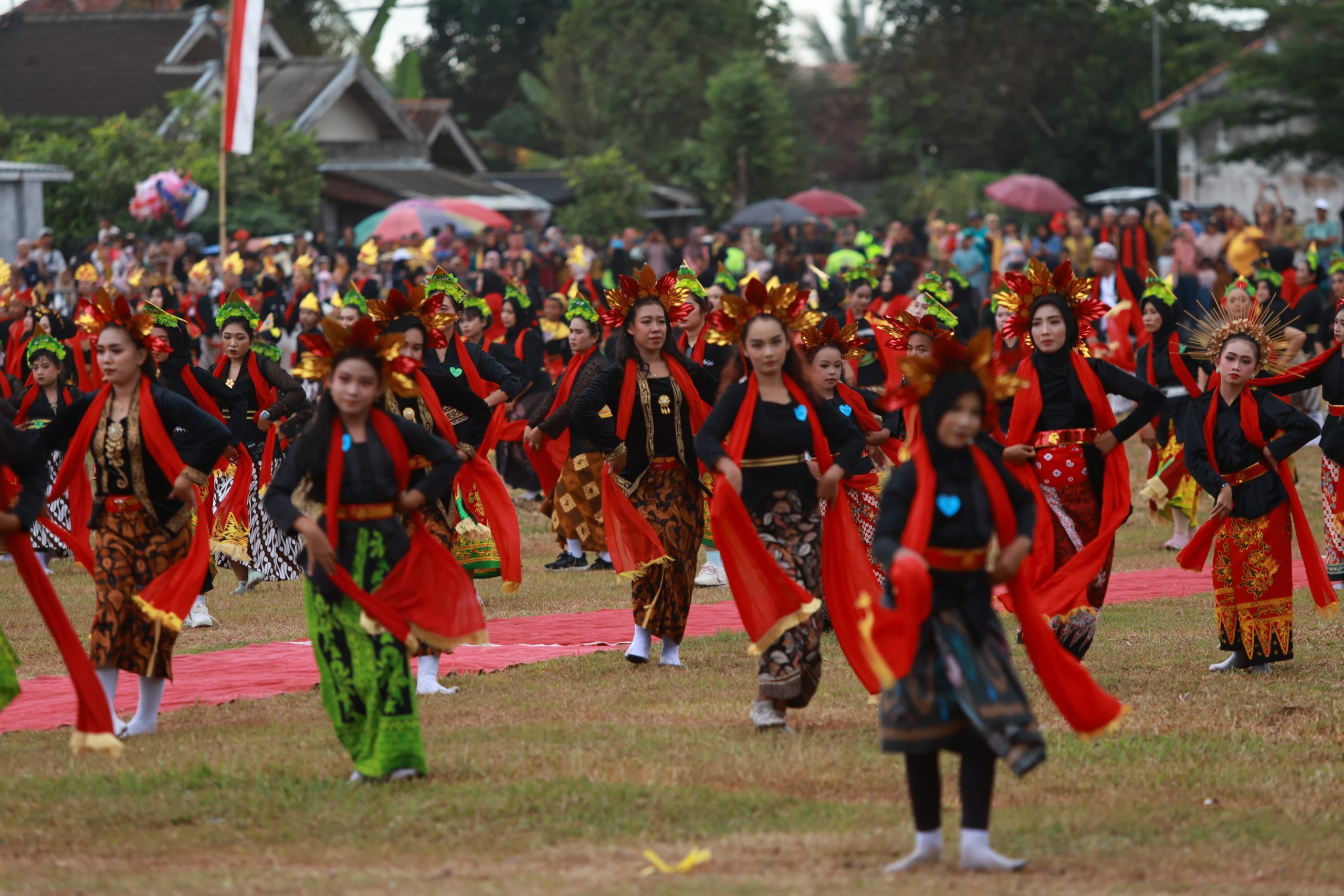 Ribuan masyarakat tumpah ruah mengelilingi lapangan desa sambil menikmati pertunjukan kolosal tersebut.