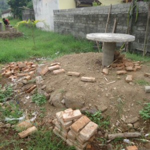 TEGALSARI – Kedua tugu pembatas didua Desa miring diduga tanah diwilayah itu labil, tugu tersebut pembatas Desa Karangmulya dan Desa Kebondalem yang