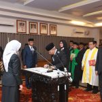 BANYUWANGI – Bupati Banyuwangi Ipuk Fiestiandani melantik tujuh pejabat Pimpinan Tinggi Pratama di lingkungan Pemkab Banyuwangi, di Kantor Bupati Banyuwangi, Selasa sore